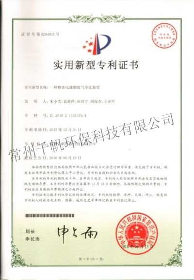 實用新型專利證書 一種整體化油煙廢氣凈化裝置