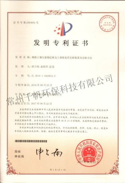 發(fā)明專利證書 模擬土壤污染物遷移及土壤修復(fù)的實驗裝置及實驗方法