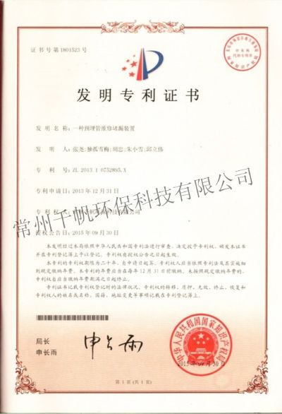 發(fā)明專利證書 一種預(yù)埋管維修堵漏裝置