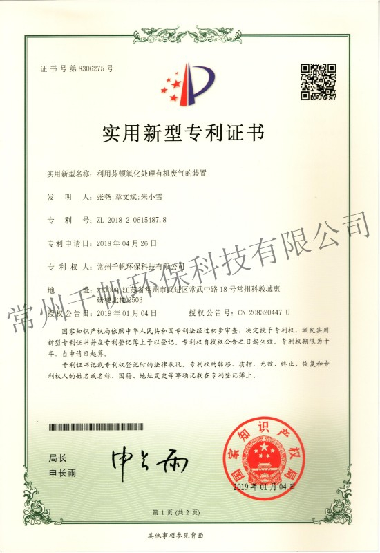 實用新型專利證書 利用芬頓氧化處理有機廢氣的裝置