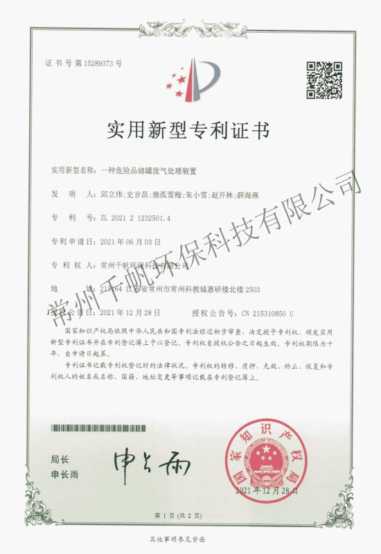 實用新型專利證書 一種危險品儲罐廢氣處理裝置