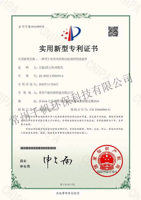 實用新型專利證書 一種用于矩形風(fēng)管轉(zhuǎn)向的加固型連接件
